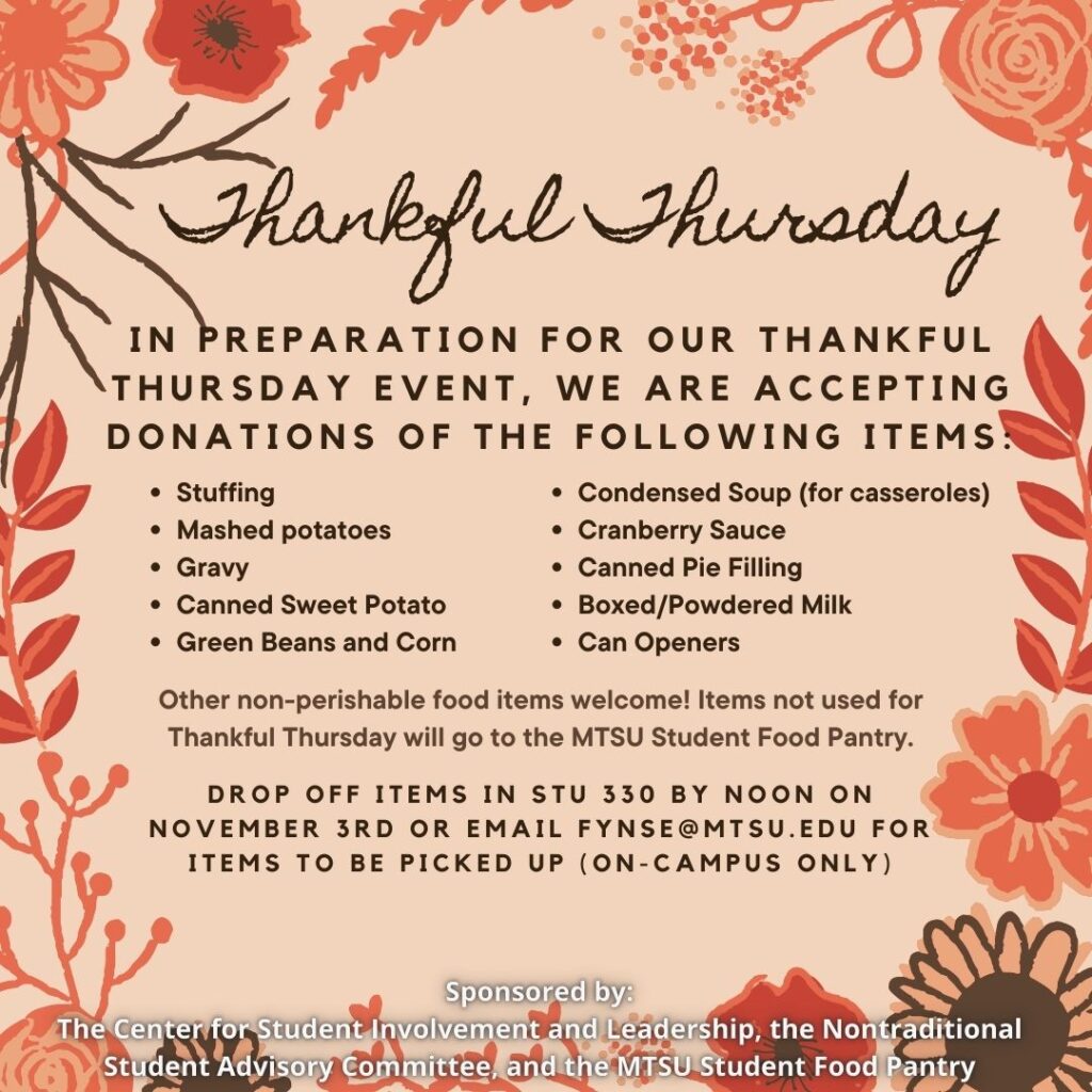 In preparation for Thanksgiving, we are accepting non-perishable side items to give away to our students! Drop off items in STU 330 (CSIL/FYNSE) by Nov 3rd at noon. Watch for info on food giveaway on Nov 6th 11am-1pm!